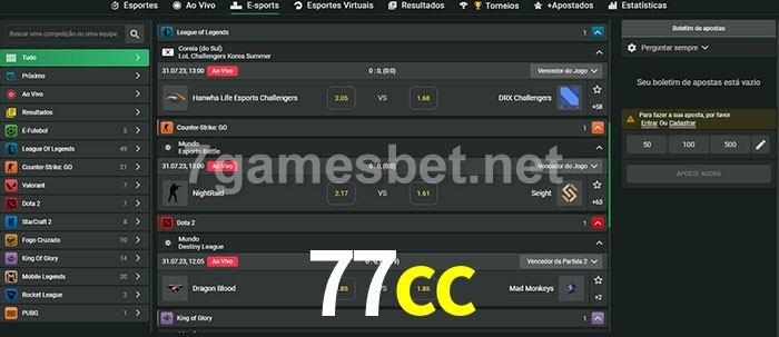 O 77cc oferece uma grande seleção de opções de apostas em e-sports com probabilidades competitivas